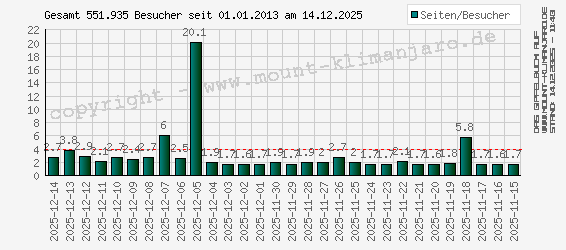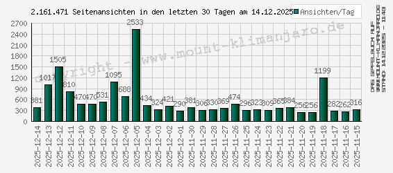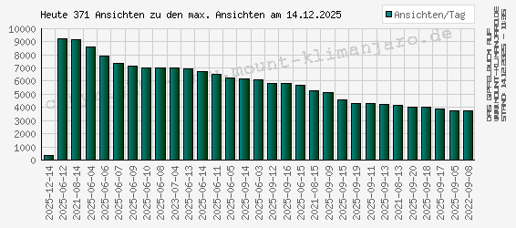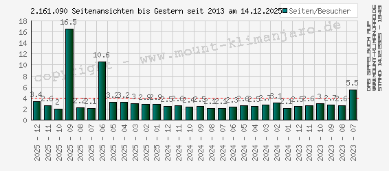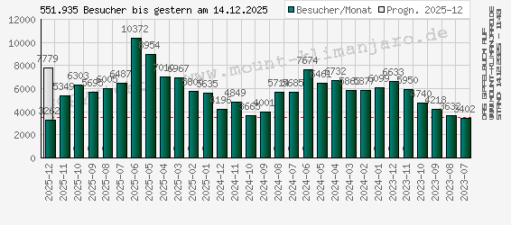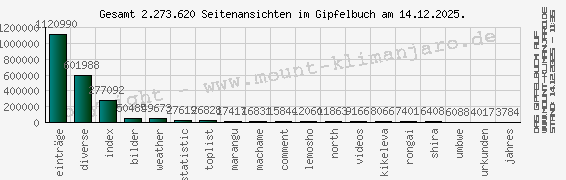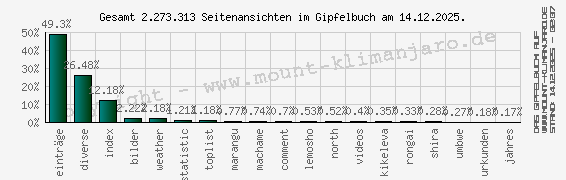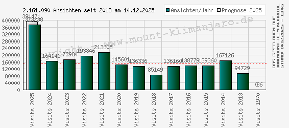 Auf dieser Statistik-Seite werden die mit den Gipfelbuch-Einträgen und Besuchen in der Datenbank hinterlegten Informationen zu den Kilimanjaro-Besteigungen statistisch ausgewertet und in 71 Grafiken, die mit jedem Seitenaufruf sich selbst aktualisieren, dargestellt.