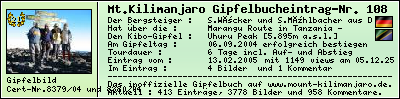 Der Gipfelerfolg am Mount Kilimanjaro : 2004Montag06September In der Zeit vom 02.09.2004 bis zum 07.09.2004 habe ich während einer 6-Tagestour mit dem Touroperator -- über die Marangu Route den Mount Kilimanjaro, den höchsten Berg Afrikas, bis zum Summit Uhuru Peak [5.895m] am 06.09.2004 erfolgreich bestiegen und lege als Zeugnis die Summit-Certificate-Nr. 8379/04 und 8380/04 bzw. das Gipfelfoto diesem Gipfelbucheintrag bei. S.Wöcker und S.Mühlbacher , 13.02.2005 Mein Kommentar zum Gipfelbucheintrag :Simone Wöcker und Stefan MühlbacherEin unvergessliches Erlebnis! Zu zweit haben wir den Gipfel bei Mondschein in einer sternklaren, aber eisigen Nacht erklommen. Wir haben kurz nach Sonnenaufgang den Uhuru Peak unter leichter Höhenkrankheit (Schwindel, Kopfweh, Übelkeit ab Gillman´s point) erreicht. Danke an unsere Guides Bryson und Simba, die uns ständig motiviert und mit ihrem Singsang nach oben getrieben haben. Jambo - Kilimanjaro : Hakuna Matata ! Meine Track-Daten im Überblick :