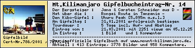 Rongai Route : « [Eintrag Nr.13] « Eintrag-Nr.14 » [Eintrag Nr.34] » Jana & Carsten Schneider - Uhuru Peak [5.895m] - 31.01.2001Akklimatisation am Mt. MeruMein Gipfelbucheintrag :Der Eintrag in das Kilimanjaro-Gipfelbuch :2001Mittwoch21März Jana & Carsten Schneider aus Lippstadt / Deutschland schrieb sich am 21.03.2001 mit dem folgenden Eintrag und