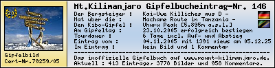 Der Gipfelerfolg am Mount Kilimanjaro : 2005Sonntag23Oktober In der Zeit vom 03.10.2005 bis zum 08.10.2005 habe ich während einer 6-Tagestour mit dem Touroperator -- über die Machame Route den Mount Kilimanjaro, den höchsten Berg Afrikas, bis zum Summit Uhuru Peak [5.895m] am 23.10.2005 erfolgreich bestiegen und lege als Zeugnis die Summit-Certificate-Nr. 79259/05 bzw. das Gipfelfoto diesem Gipfelbucheintrag bei. Kai-Uwe Killiches , 04.11.2005 Mein Kommentar zum Gipfelbucheintrag :Schoene Tour und einfacher als vorhergedacht.Jambo - I`ve made it ! Meine Track-Daten im Überblick :
