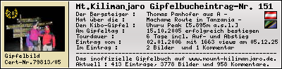 Der Gipfelerfolg am Mount Kilimanjaro : 2005Sonnabend15Oktober In der Zeit vom 11.10.2005 bis zum 16.10.2005 habe ich während einer 6-Tagestour mit dem Touroperator -- über die Machame Route den Mount Kilimanjaro, den höchsten Berg Afrikas, bis zum Summit Uhuru Peak [5.895m] am 15.10.2005 erfolgreich bestiegen und lege als Zeugnis die Summit-Certificate-Nr. 79813/05 bzw. das Gipfelfoto diesem Gipfelbucheintrag bei. Thomas Panhofer , 02.01.2006 Mein Kommentar zum Gipfelbucheintrag :Wir haben´s alle 3 geschafft: Peter (auf dem ersten Foto links), ich (rechts) und Werner (auf dem zweiten Foto). Wir waren leider zu schnell und schon um 5:00 Uhr oben und es war zu kalt, um auf den Sonnenaufgang zu warten. Aber trotzdem ein tolles Erlebnis.Jambo - Kilimanjaro : Hakuna Matata ! Meine Track-Daten im Überblick :