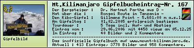 Der Gipfelerfolg am Mount Kilimanjaro : 2005Dienstag01Februar In der Zeit vom 28.01.2005 bis zum 02.02.2005 habe ich während einer 5-Tagestour mit dem Touroperator -- über die Rongai Route den Mount Kilimanjaro, den höchsten Berg Afrikas, bis zum Summit Gillmans Point [5.681m] am 01.02.2005 erfolgreich bestiegen und lege als Zeugnis die Summit-Certificate-Nr. bzw. das Gipfelfoto diesem Gipfelbucheintrag bei. Dr. Hartmut Parthe , 29.06.2006 Mein Kommentar zum Gipfelbucheintrag :Kilimanjaro-Besteigung via Rongai Route im Januar / Februar 2005 mit Freunden aus der Prignitz.Jambo - Kilimanjaro : Hakuna Matata ! Meine Track-Daten im Überblick :