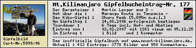 Informationen zur eigenen Besteigung des Mount Kilimanjaro, des höchsten Berg Afrikas, in das inoffizielle Gipfelbuch (The inofficial Mount Kilimanjaro Summit Log) auf www.mount-kilimanjaro.de ein.