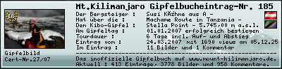 Bilderliste :Diese Galerie ist für javafähigen PC optimiert. Rating :Bewerte diesen Kilimanjaro-Gipfelbucheintrag.