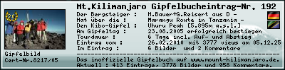 Der Gipfelerfolg am Mount Kilimanjaro : 2005Dienstag23August In der Zeit vom 19.08.2005 bis zum 24.08.2005 habe ich während einer 6-Tagestour mit dem Touroperator Wikinger über die Marangu Route den Mount Kilimanjaro, den höchsten Berg Afrikas, bis zum Summit Uhuru Peak [5.895m] am 23.08.2005 erfolgreich bestiegen und lege als Zeugnis die Summit-Certificate-Nr. 8217/05 bzw. das Gipfelfoto diesem Gipfelbucheintrag bei. H.Bauer+G.Reisert , 26.02.2010 Mein Kommentar zum Gipfelbucheintrag :Helmut Bauer und Gisela ReisertGisela, ich und acht weitere Gruppenmitglieder starten am 19.08.2005 unsere unvergessene Tour auf den Gipfel des Kilimanjaro. Das Wetter hätte nicht besser sein können den wir hatten während der gesamten Zeit am Berg keinen einzigen schlechten Tag. Unser Reiseleiter Horst Bachmann von Wikinger führte uns mit seiner sehr Netten und Ruhigen Art vom ersten bis zum letzten Tag sicher auf den Berg und wieder herunter. Von unseren 10 Leuten schafften es immerhin 2 auf 5000m, 2 bis auf den Gillmans Point, und die übrigen 6 bis auf den Gipfel. Ich glaube es wird uns allen ein unvergessliches Erlebniss bleiben. PS Besonderen Dank unserm Einheimischem Begleiter Oswald und allen anderen durchweg sehr netten 25 Trägern. Meine Track-Daten im Überblick :