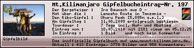 Informationen zur eigenen Besteigung des Mount Kilimanjaro, des höchsten Berg Afrikas, in das inoffizielle Gipfelbuch (The inofficial Mount Kilimanjaro Summit Log) auf www.mount-kilimanjaro.de ein.