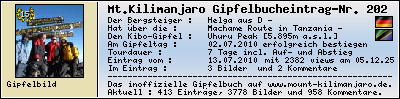 Informationen zur eigenen Besteigung des Mount Kilimanjaro, des höchsten Berg Afrikas, in das inoffizielle Gipfelbuch (The inofficial Mount Kilimanjaro Summit Log) auf www.mount-kilimanjaro.de ein.