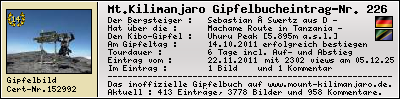 Informationen zur eigenen Besteigung des Mount Kilimanjaro, des höchsten Berg Afrikas, in das inoffizielle Gipfelbuch (The inofficial Mount Kilimanjaro Summit Log) auf www.mount-kilimanjaro.de ein.