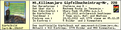 Informationen zur eigenen Besteigung des Mount Kilimanjaro, des höchsten Berg Afrikas, in das inoffizielle Gipfelbuch (The inofficial Mount Kilimanjaro Summit Log) auf www.mount-kilimanjaro.de ein.