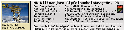 Der Gipfelerfolg am Mount Kilimanjaro : 1996Freitag29März In der Zeit vom 24.03.1996 bis zum 30.03.1996 habe ich während einer 6-Tagestour mit dem Touroperator -- über die Marangu Route den Mount Kilimanjaro, den höchsten Berg Afrikas, bis zum Summit Gillmans Point [5.681m] am 29.03.1996 erfolgreich bestiegen und lege als Zeugnis die Summit-Certificate-Nr. 2149/96 bzw. das Gipfelfoto diesem Gipfelbucheintrag bei. Dr.H.-W.Wolter , 02.09.2001 Mein Kommentar zum Gipfelbucheintrag :Ein unvergeßliches Erlebnis - wenn auch wahnsinnig anstrengend, auf den letzten 150 Höhenmetern !Dr. Hans-Winfried Wolter Jambo - I`ve made it ! Meine Track-Daten im Überblick :