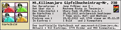 Informationen zur eigenen Besteigung des Mount Kilimanjaro, des höchsten Berg Afrikas, in das inoffizielle Gipfelbuch (The inofficial Mount Kilimanjaro Summit Log) auf www.mount-kilimanjaro.de ein.