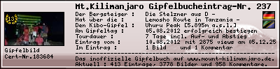 Bilderliste :Diese Galerie ist für javafähigen PC optimiert. Rating :Bewerte diesen Kilimanjaro-Gipfelbucheintrag.