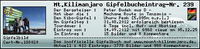 Informationen zur eigenen Besteigung des Mount Kilimanjaro, des höchsten Berg Afrikas, in das inoffizielle Gipfelbuch (The inofficial Mount Kilimanjaro Summit Log) auf www.mount-kilimanjaro.de ein.