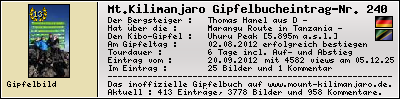 Informationen zur eigenen Besteigung des Mount Kilimanjaro, des höchsten Berg Afrikas, in das inoffizielle Gipfelbuch (The inofficial Mount Kilimanjaro Summit Log) auf www.mount-kilimanjaro.de ein.