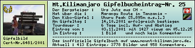 Bilderliste :Diese Galerie ist für javafähigen PC optimiert. Rating :Bewerte diesen Kilimanjaro-Gipfelbucheintrag.