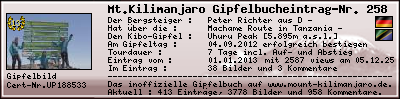 Der Gipfelerfolg am Mount Kilimanjaro : 2012Dienstag04September In der Zeit vom 30.08.2012 bis zum 05.09.2012 habe ich während einer 7-Tagestour mit dem Touroperator Paradise-Safari, Arusha über die Machame Route den Mount Kilimanjaro, den höchsten Berg Afrikas, bis zum Summit Uhuru Peak [5.895m] am 04.09.2012 erfolgreich bestiegen und lege als Zeugnis die Summit-Certificate-Nr. UP188533 bzw. das Gipfelfoto diesem Gipfelbucheintrag bei. Peter Richter , 01.01.2013 Mein Kommentar zum Gipfelbucheintrag :Wir hatten traumhaftes Wetter, wenig Wolken, kaum Wind, moderate Temperaturen und tolle Vollmondnächte mit phantastisch angestrahltem Kili.Unsere 3er Gruppe wies eine deutliche Altersdifferenz aus: Von meinen 58 J bis zu meinen beiden Söhnen mit 22 J bzw 19 J. Unsere Tour: Machame Route mit zusätzlicher Übernachtung im Karanga Camp und Tagaufstieg (Start 5 Uhr) Diese Kombination hat sich für uns und insbesondere für mich als optimal erwiesen: Die Tour vom Baranca Camp bis zum Barafu Camp auf 2 Tage aufzuteilen und die zusätzlichen Ruhestunden bis 5 Uhr waren sehr hilfreich, um die körperlichen Resourcen zu schonen. Man muß jedoch auf einen „ruhigen“ Lagerplatz möglichst im Randbereich des Barafu Camps achten. Wir sind im Morgengrauen gestartet, haben einen wunderbaren Sonnenaufgang mit dem Mawenzi im Vordergrund erlebt. Tolle Beleuchtung des Kilimanjaro und des Rebmann Gletschers im schrägstehenden Morgenlicht. Die Temperaturen in der aufgehenden Sonne waren angenehm . Den Aufstieg „sehend“ zu erleben war ein tolles Erlebnis. Großer Vorteil: Während des gesamten Aufstiegs waren wir allein! Kurz nach 11 Uhr ereichten wir den Uhuru Peak und - wir hatten den Gipfel für uns alleine - herrliche Ruhe – ungestörtes Geniesen - kein Anstehen beim Gipfelfoto ! Traumhaft! Meine Track-Daten im Überblick :