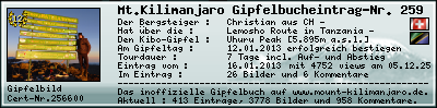 Bilderliste :Diese Galerie ist für javafähigen PC optimiert. Rating :Bewerte diesen Kilimanjaro-Gipfelbucheintrag.
