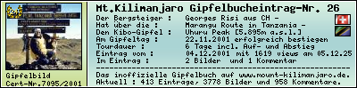 Bilderliste :Diese Galerie ist für javafähigen PC optimiert. Rating :Bewerte diesen Kilimanjaro-Gipfelbucheintrag.
