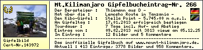Informationen zur eigenen Besteigung des Mount Kilimanjaro, des höchsten Berg Afrikas, in das inoffizielle Gipfelbuch (The inofficial Mount Kilimanjaro Summit Log) auf www.mount-kilimanjaro.de ein.
