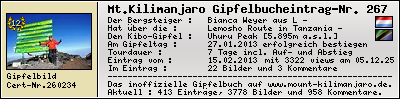Informationen zur eigenen Besteigung des Mount Kilimanjaro, des höchsten Berg Afrikas, in das inoffizielle Gipfelbuch (The inofficial Mount Kilimanjaro Summit Log) auf www.mount-kilimanjaro.de ein.