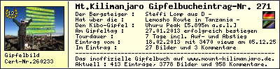Der Gipfelerfolg am Mount Kilimanjaro : 2013Sonntag27Januar In der Zeit vom 22.01.2013 bis zum 28.01.2013 habe ich während einer 7-Tagestour mit dem Touroperator Basecamp Tanzania über die Lemosho Route den Mount Kilimanjaro, den höchsten Berg Afrikas, bis zum Summit Uhuru Peak [5.895m] am 27.01.2013 erfolgreich bestiegen und lege als Zeugnis die Summit-Certificate-Nr. 260233 bzw. das Gipfelfoto diesem Gipfelbucheintrag bei. Steffi Lomp , 18.02.2013 Mein Kommentar zum Gipfelbucheintrag :4 Jahre sind seit meiner letzten Kilimanjaro Besteigung vergangen. In der Zeit ist viel passiert - wo damals 5 Zelte standen, stehen heute 50!! Keine Ahnung, ob es an der Lemosho Route liegt, oder der Tourismus am berg generell so extrem zugenommen hat.Ich möchte gerne nochmal rauf, das nächste Mal sehr gerne über die Umbwe Route via Western Breach. Den kompletten Bericht mit vielen Fotos und ein paar kleinen Videos gibt es hier: http://steffi-luka.com/?s=kilimanjaro+2013 Meine Track-Daten im Überblick :