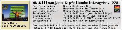 Bilderliste :Diese Galerie ist für javafähigen PC optimiert. Rating :Bewerte diesen Kilimanjaro-Gipfelbucheintrag.