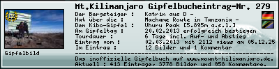 Informationen zur eigenen Besteigung des Mount Kilimanjaro, des höchsten Berg Afrikas, in das inoffizielle Gipfelbuch (The inofficial Mount Kilimanjaro Summit Log) auf www.mount-kilimanjaro.de ein.