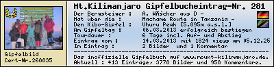Der Gipfelerfolg am Mount Kilimanjaro : 2013Mittwoch06März In der Zeit vom 02.03.2013 bis zum 07.03.2013 habe ich während einer 6-Tagestour mit dem Touroperator Elefant-Tours über die Machame Route den Mount Kilimanjaro, den höchsten Berg Afrikas, bis zum Summit Uhuru Peak [5.895m] am 06.03.2013 erfolgreich bestiegen und lege als Zeugnis die Summit-Certificate-Nr. 268835 bzw. das Gipfelfoto diesem Gipfelbucheintrag bei. A. Wöcker , 14.03.2013 Mein Kommentar zum Gipfelbucheintrag :Nächtlicher Aufstieg bei frischen Schnee im Barafu Camp. Alles weiß und überzuckert. Wundervoller Sonnenaufgang am Kraterrand auf dem Weg zum Uhuru Peak. Ein unvergessliches Erlebnis...Jambo - Kilimanjaro : Hakuna Matata ! Meine Track-Daten im Überblick :