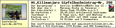 Informationen zur eigenen Besteigung des Mount Kilimanjaro, des höchsten Berg Afrikas, in das inoffizielle Gipfelbuch (The inofficial Mount Kilimanjaro Summit Log) auf www.mount-kilimanjaro.de ein.