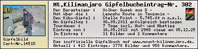 Bilderliste :Diese Galerie ist für javafähigen PC optimiert. Rating :Bewerte diesen Kilimanjaro-Gipfelbucheintrag.