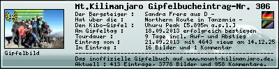 Der Gipfelerfolg am Mount Kilimanjaro : 2013Mittwoch18September In der Zeit vom 11.09.2013 bis zum 19.09.2013 habe ich während einer 9-Tagestour mit dem Touroperator Mauly Tours über die Northern Circuit den Mount Kilimanjaro, den höchsten Berg Afrikas, bis zum Summit Uhuru Peak [5.895m] am 18.09.2013 erfolgreich bestiegen und lege als Zeugnis die Summit-Certificate-Nr. bzw. das Gipfelfoto diesem Gipfelbucheintrag bei. Sandra Frers , 21.09.2013 Mein Kommentar zum Gipfelbucheintrag :Route Northern Circuit via :- Start : Londorossi Gate - 1.Tag : Big Tree Camp - 2.Tag : Shira Camp 1 - 3.Tag : Shira Camp 2 - 4.Tag : Moir Camp - 5.Tag : Pofu Camp - 6.Tag : Third Cave Camp - 7.Tag : Kibo Hut - 8.Tag : Uhuru Peak -> Mweka Camp - 9.Tag : Mweka Gate Meine Track-Daten im Überblick :