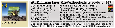 Der Gipfelerfolg am Mount Kilimanjaro : 2013Montag16September In der Zeit vom 12.09.2013 bis zum 17.09.2013 habe ich während einer 6-Tagestour mit dem Touroperator MojaTravel / MaulyTours über die Marangu Route den Mount Kilimanjaro, den höchsten Berg Afrikas, bis zum Summit Uhuru Peak [5.895m] am 16.09.2013 erfolgreich bestiegen und lege als Zeugnis die Summit-Certificate-Nr. bzw. das Gipfelfoto diesem Gipfelbucheintrag bei. Frank Flammersberger , 24.09.2013 Mein Kommentar zum Gipfelbucheintrag :Auch wenn Sie es wohl niemals lesen werden, möchte ich mich bei meiner Crew bedanken, denn ohne sie wäre es nie möglich gewesen, meinen Traum zu erfüllen!Meine ausführliche Tourenbeschreibung ist im Mount-Kilimanjaro-Forum zu finden unter folgender Short-URL : http://goo.gl/5IyCu7 bzw. über den nebenstehenden Kommunikations-Link zur Website. Meine Track-Daten im Überblick :