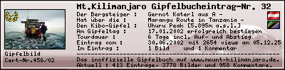 Der Gipfelerfolg am Mount Kilimanjaro : 2002Donnerstag17Januar In der Zeit vom 13.01.2002 bis zum 18.02.2002 habe ich während einer 6-Tagestour mit dem Touroperator Zara Tours über die Marangu Route den Mount Kilimanjaro, den höchsten Berg Afrikas, bis zum Summit Uhuru Peak [5.895m] am 17.01.2002 erfolgreich bestiegen und lege als Zeugnis die Summit-Certificate-Nr. 456/02 bzw. das Gipfelfoto diesem Gipfelbucheintrag bei. Gernot Katerl , 30.06.2002 Mein Kommentar zum Gipfelbucheintrag :Die Besteigung erfolgte gemeinsam mit meinem Freund Kurt Benzer (Eintrag Nr. 28) ! Seinem Kommentar will ich mich anschließen und gleichzeitig unsere Guides Dixon und Jackson (Zara Tours) empfehlen, denen wir viel zu verdanken haben! Je stärker dein Wille, umso näher dein Ziel !Jambo - I`ve made it ! Meine Track-Daten im Überblick :