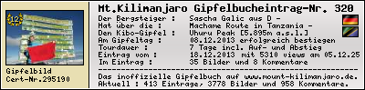 Bilderliste :Diese Galerie ist für javafähigen PC optimiert. Rating :Bewerte diesen Kilimanjaro-Gipfelbucheintrag.