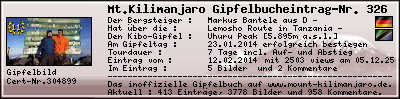 Informationen zur eigenen Besteigung des Mount Kilimanjaro, des höchsten Berg Afrikas, in das inoffizielle Gipfelbuch (The inofficial Mount Kilimanjaro Summit Log) auf www.mount-kilimanjaro.de ein.