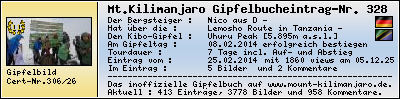 Der Gipfelerfolg am Mount Kilimanjaro : 2014Sonnabend08Februar In der Zeit vom 03.02.2014 bis zum 09.02.2014 habe ich während einer 7-Tagestour mit dem Touroperator mit Afromaxx über die Lemosho Route den Mount Kilimanjaro, den höchsten Berg Afrikas, bis zum Summit Uhuru Peak [5.895m] am 08.02.2014 erfolgreich bestiegen und lege als Zeugnis die Summit-Certificate-Nr. 306/26 bzw. das Gipfelfoto diesem Gipfelbucheintrag bei. Nico , 25.02.2014 Mein Kommentar zum Gipfelbucheintrag :Meine Besteigung fand im Februar 2014 mit dem Tour-Operator "Afromaxx" statt, die wirklich alles für uns gegeben haben. Unter zwiespältigen Wetterbedingungen, scheinbar war der Monsun mit seinen Vorboten schon da, stiegen wir über die normale Lemosho-Route dem Kibo aufs Haupt. Aber das ich mal im Schnee am Äquator stehen würde, hätte ich mir nie gedacht, aber das machte es umso schöner, auch wenn es den letzten Anstieg in der Gipfelnacht nicht leichter machte. Aber mit unseren Klasse-Guides und ihrem Team war das ein besonderes Erlebnis für uns alle!Jambo - Kilimanjaro : Hakuna Matata ! Meine Track-Daten im Überblick :