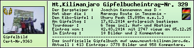 Marangu Route : « [Eintrag Nr.324] « Eintrag-Nr.329 » [Eintrag Nr.334] » Joachim Kennemann - Uhuru Peak [5.895m] - 17.02.2014Februar 2014Mein Gipfelbucheintrag :Der Eintrag in das Kilimanjaro-Gipfelbuch :2014Sonntag02März Joachim Kennemann aus Jena / Deutschland schrieb sich am 02.03.2014 mit dem folgenden Eintrag und