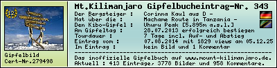 Machame Route : « [Eintrag Nr.342] « Eintrag-Nr.343 » [Eintrag Nr.345] » Corinna Kaul - Uhuru Peak [5.895m] - 28.07.2013Uhuru-Peak am 28.07.2013Mein Gipfelbucheintrag :Der Eintrag in das Kilimanjaro-Gipfelbuch :2014Donnerstag07August Corinna Kaul aus Oberhausen / Deutschland schrieb sich am 07.08.2014 mit dem folgenden Eintrag und