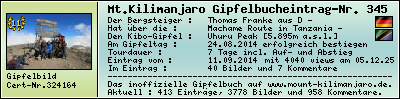 Informationen zur eigenen Besteigung des Mount Kilimanjaro, des höchsten Berg Afrikas, in das inoffizielle Gipfelbuch (The inofficial Mount Kilimanjaro Summit Log) auf www.mount-kilimanjaro.de ein.