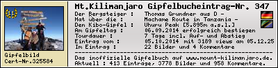 Informationen zur eigenen Besteigung des Mount Kilimanjaro, des höchsten Berg Afrikas, in das inoffizielle Gipfelbuch (The inofficial Mount Kilimanjaro Summit Log) auf www.mount-kilimanjaro.de ein.