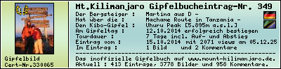 Bilderliste :Diese Galerie ist für javafähigen PC optimiert. Rating :Bewerte diesen Kilimanjaro-Gipfelbucheintrag.