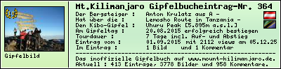 Informationen zur eigenen Besteigung des Mount Kilimanjaro, des höchsten Berg Afrikas, in das inoffizielle Gipfelbuch (The inofficial Mount Kilimanjaro Summit Log) auf www.mount-kilimanjaro.de ein.