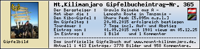 Informationen zur eigenen Besteigung des Mount Kilimanjaro, des höchsten Berg Afrikas, in das inoffizielle Gipfelbuch (The inofficial Mount Kilimanjaro Summit Log) auf www.mount-kilimanjaro.de ein.