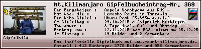 Mit 86 Jahren am Uhuru PeakDer historische Gipfelbucheintrag :Der Eintrag in das Kilimanjaro-Gipfelbuch :2015Donnerstag12November Angela Vorobyova aus Ulan-Ude / Russian Federation wurde am 12.11.2015 mit dem folgenden Eintrag und