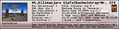 Informationen zur eigenen Besteigung des Mount Kilimanjaro, des höchsten Berg Afrikas, in das inoffizielle Gipfelbuch (The inofficial Mount Kilimanjaro Summit Log) auf www.mount-kilimanjaro.de ein.