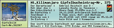 Der Gipfelerfolg am Mount Kilimanjaro : 2015Sonnabend14November In der Zeit vom 07.11.2014 bis zum 15.11.2015 habe ich während einer 9-Tagestour mit dem Touroperator African Spoonbill tours über die Lemosho Route den Mount Kilimanjaro, den höchsten Berg Afrikas, bis zum Summit Uhuru Peak [5.895m] am 14.11.2015 erfolgreich bestiegen und lege als Zeugnis die Summit-Certificate-Nr. 362367 bzw. das Gipfelfoto diesem Gipfelbucheintrag bei. Gabriel Reichelt , 03.03.2016 Mein Kommentar zum Gipfelbucheintrag :folgtJambo - Kilimanjaro : Hakuna Matata ! Meine Track-Daten im Überblick :