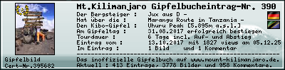 Informationen zur eigenen Besteigung des Mount Kilimanjaro, des höchsten Berg Afrikas, in das inoffizielle Gipfelbuch (The inofficial Mount Kilimanjaro Summit Log) auf www.mount-kilimanjaro.de ein.