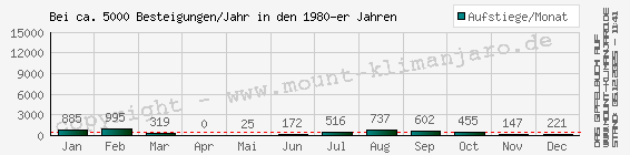 Die Kilimanjaro-Besteigungen in den 1980-er Jahren:Die Monats-Besteigungen auf allen Routen (Show/Hide)Die aktuelle Routennutzung am Mount Kilimanjaro :Die von mir / uns begangene Machame Route wurde im Verhältnis zu den weiteren Routen am Mount Kilimanjaro entsprechend folgender Grafik von allen Besteigern aus dem Kilimanjaro-Gipfelbuch zum Gipfelaufstieg genutzt.Die gesamten Kilimanjaro-Gipfelbucheinträge am 05.12.2025 Verteilung der Gipfelbuch-Einträge auf die einzelnen Routen : prozentual Die maximalen Besteigungen am Kilimanjaro (2013) :1.0 Die Monats-Besteigungen auf allen Routen (Show/Hide)2.0 Die Monats-Besteigungen auf der Machame Route (Show/Hide) 3.0 Die Tages-Besteigungen auf der Machame Route (Show/Hide) Das Wetter am Kilimanjaro zu meiner Besteigung :Die durchschnittlichen Wetter- / Klimadaten am Kilimanjaro während des 03.10.1989, zum Zeitraumes meiner Gipfel-Besteigung, im Verhältnis zu den anderen Monaten sind aus dem folgenden Niederschlags- und Temperaturdiagramm zu entnehmen. Basis der Durchschnittswerte sind Meteorologische Berechnungen der letzten 20 Jahren. Die tatsächlichen Werte können somit abweichen.Die Jahreszeit zu meiner Besteigung : Ende der langen Trockenzeit (Frühling) Der monatliche Durchschnitts-Niederschlag in Moshi am Fuß des Kibo in mm/M Temperatur - Mässig - min. 16°C - max. 31°C , Jahreszeit - Grosse Trockenzeit . Im Besteigungungsmonat Oktober - Besucherzahl: Mittel (Hauptsaison). Der monatliche Schneefall am Gipfel des Kibo ab 5.700 m a.m.S.L. im Oktober in cm Im Zusammenhang mit dem Schneefall in den anderen Monaten des Jahres . Die monatlichen Durchschnitts-Temperaturen in Moshi im Oktober in °C Im Zusammenhang mit den anderen Monatstemperaturen des Jahres . Die monatlichen Temperaturen in den versch. Höhenlagen am Kibo im Oktober in °C Im Zusammenhang mit den anderen Monatstemperaturen des Jahres . Rechtlicher Hinweis : Die aufgeführten Klimawerte sind Durchschnittswerte und daher nur bedingt als Klimaprognose / Wettervorhersage geeignet. Ein Rechtsanspruch daraus ist prinzipiell ausgeschlossen. Meine Kilimanjaro-Gipfelbilder (0 Bilder) :Diese Galerie ist für die Betrachtung mit Smartphones optimiert.Die folgenden Bilder meiner Kilimanjaro-Besteigung habe ich meinem Gipfelbucheintrag hinzugefügt.