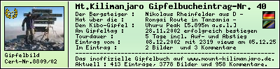 Der Gipfelerfolg am Mount Kilimanjaro : 2002Donnerstag28November In der Zeit vom 24.11.2002 bis zum 29.11.2002 habe ich während einer 5-Tagestour mit dem Touroperator -- über die Rongai Route den Mount Kilimanjaro, den höchsten Berg Afrikas, bis zum Summit Uhuru Peak [5.895m] am 28.11.2002 erfolgreich bestiegen und lege als Zeugnis die Summit-Certificate-Nr. 8809/02 bzw. das Gipfelfoto diesem Gipfelbucheintrag bei. Nikolaus Rheinfelder , 08.12.2002 Mein Kommentar zum Gipfelbucheintrag :War ja mein 2 Versuch, bin überglücklich das es jetzt geklappt hat.Jambo - Kilimanjaro : Hakuna Matata ! Meine Track-Daten im Überblick :