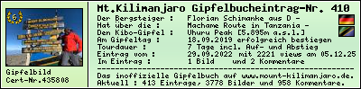 Kilimanjaro-Gipfelbucheintrag Nr. 410